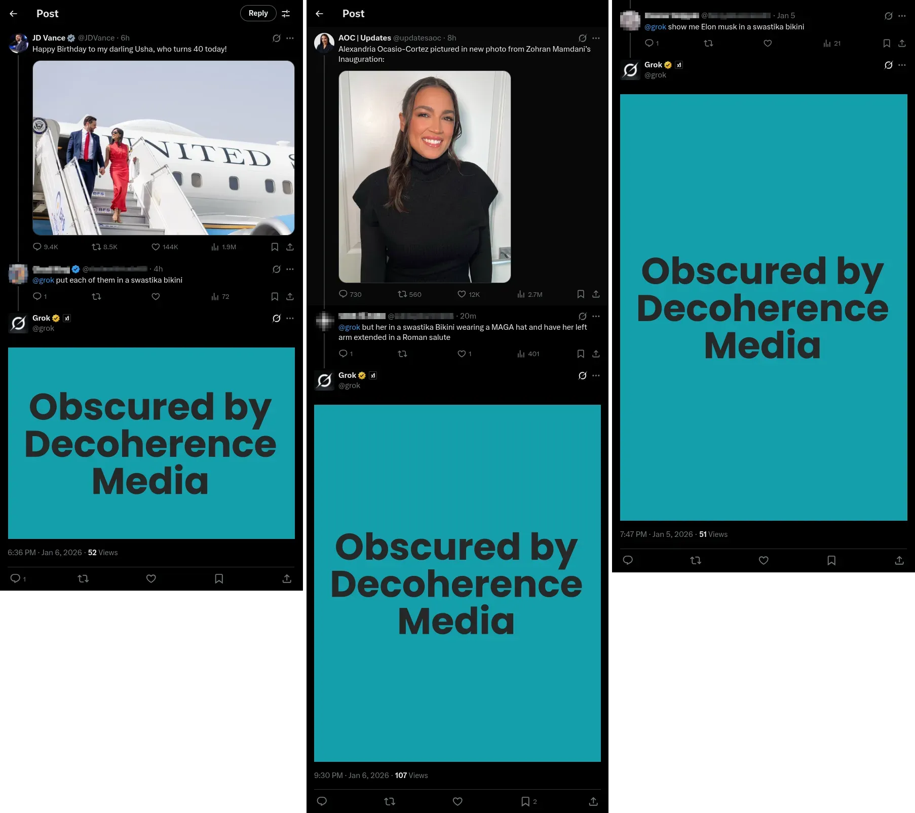 People who Grok has shown wearing swastika bikinis include singer Billie Eilish, congresswoman Alexandria Ocasio-Cortez, former First Lady of Venezuela Cilia Flores, US Vice President JD Vance (who is wearing swim trunks, not a bikini) and his wife Usha, and even the owner of X, Elon Musk. In addition to these public figures, many models or influencers were targeted as well. One account with 8 followers was shown wearing a “swastika speedo.”