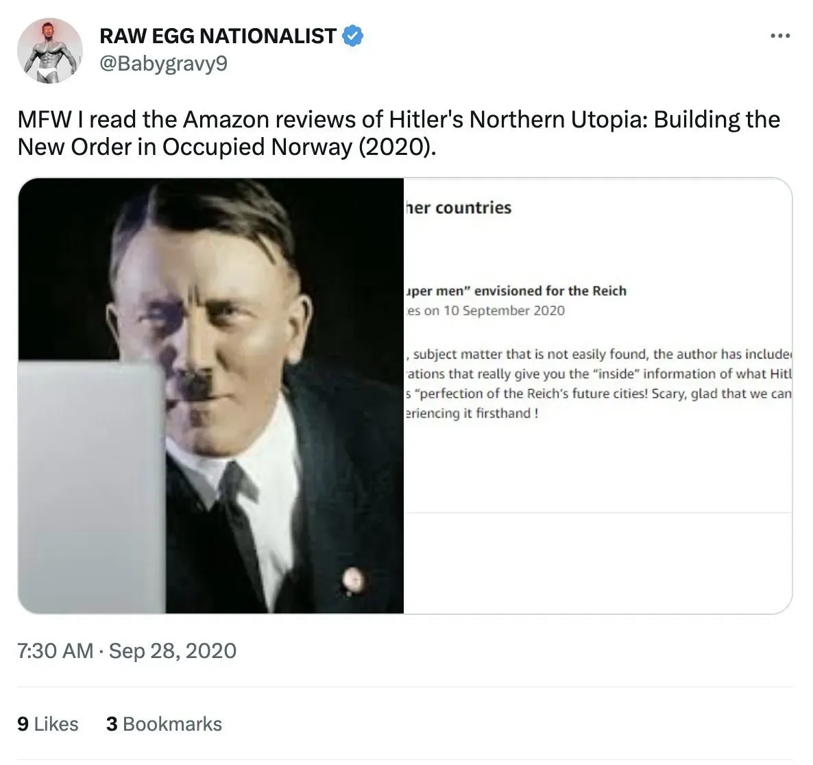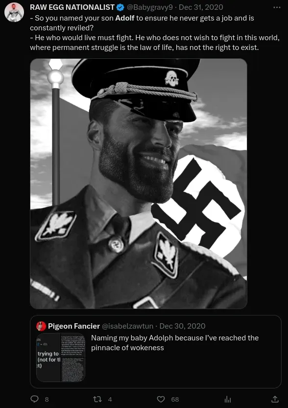 Left: screenshot of X post from Raw Egg Nationalist using a picture of Adolf Hitler as a meme; right: screenshot of X post from Raw Egg Nationalist quoting "Mein Kampf" and showing “GigaChad” wearing a Nazi uniform.