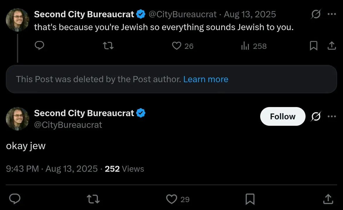 Left: screenshot of X post from Second City Bureaucrat replying with “okay jew”; right: screenshot of X post from Second City Bureaucrat using the antisemitic term “ZOG” (Zionist-Occupied Government).