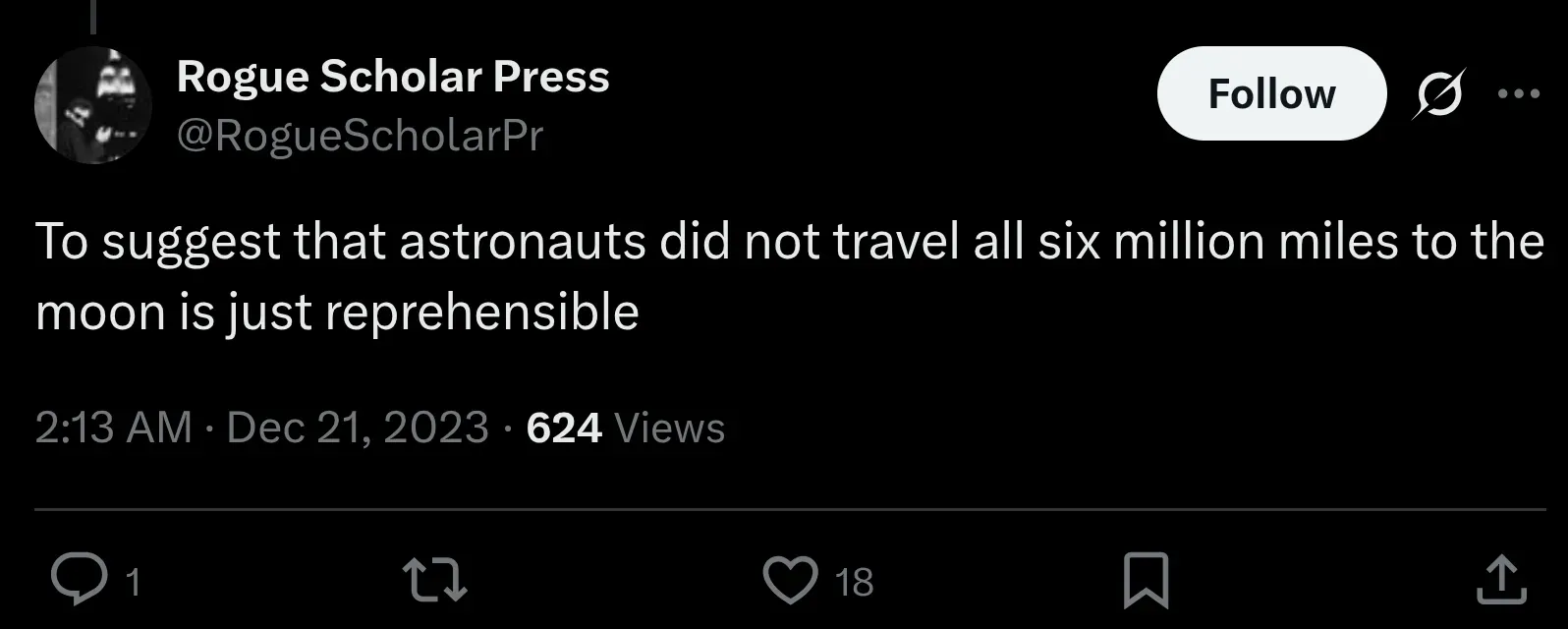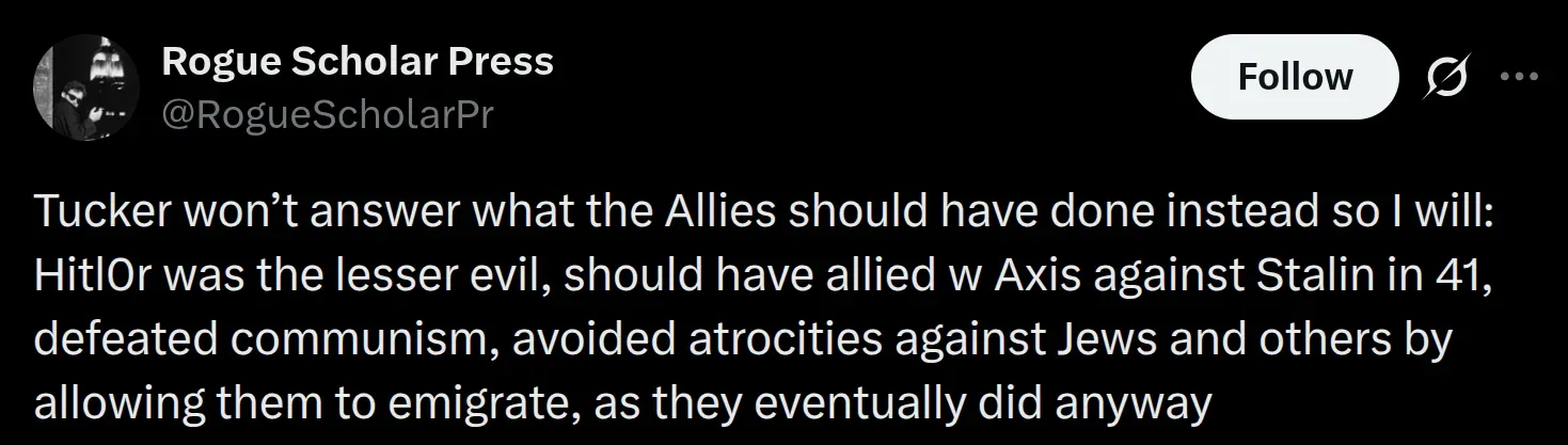 Left: screenshot of X post from Rogue Scholar Press saying that Adolf Hitler was “the lesser evil”; right: screenshot of X post from Rogue Scholar Press making a joke referencing Holocaust denial.