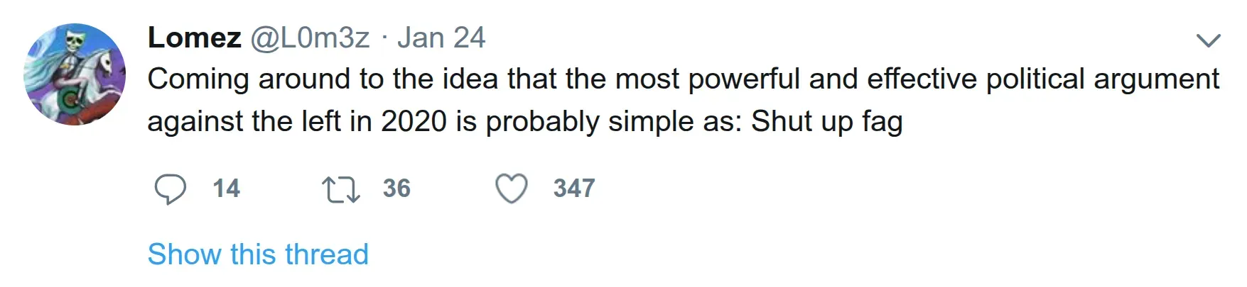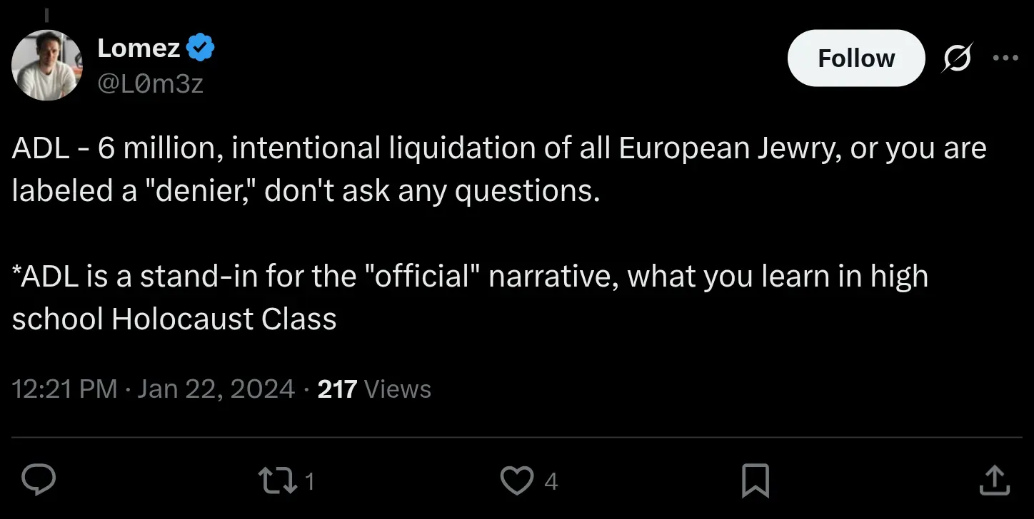 Most of these accounts eschew conventional white supremacist rhetoric, opting instead for irony and trolling. They are more likely to make jokes referencing Holocaust denial talking points, or mock the veneration of the Holocaust “narrative” in Western society, than engage in outright Holocaust denial. Some employ their rhetoric under the guise of “shock humor,” while others attempt a scholarly and professorial tone.