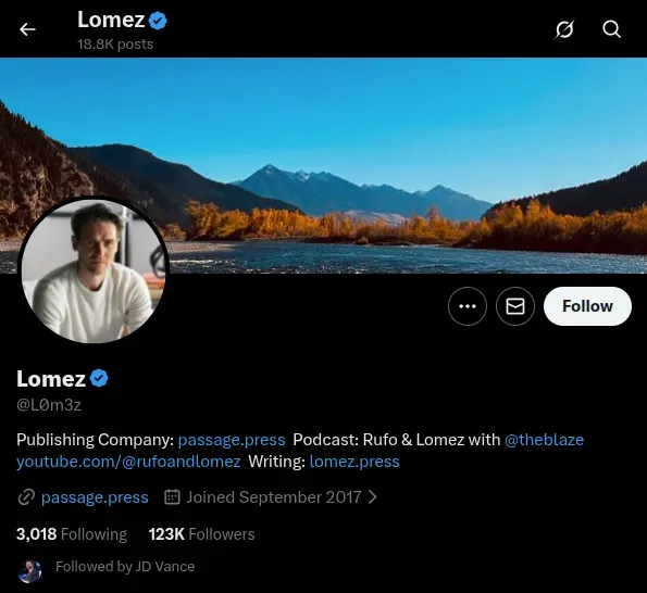 Identified as former University of California, Irvine lecturer Jonathan Keeperman in 2024, “Lomez” is the CEO of the far-right publishing company Foundation Publishing Group. On his X account, Keeperman complained that you couldn’t “ask any questions” about 6 million Jews dying in the Holocaust, and advocated for killing journalists (“lamppost the journos”). His follow from Vance predates the 2024 election.