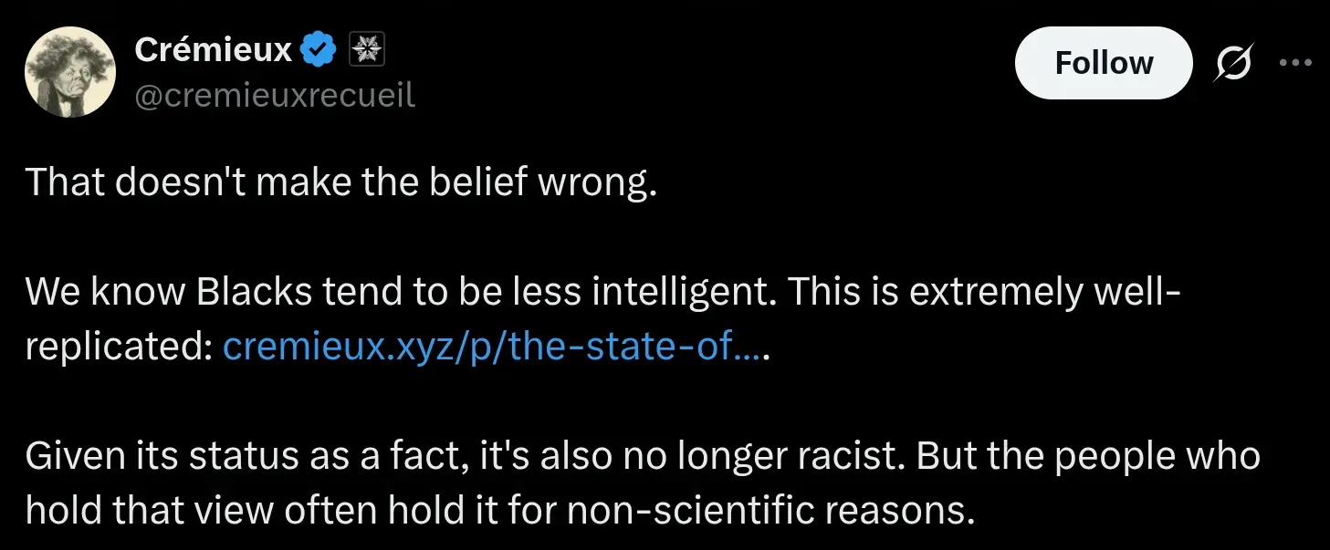 “Crémieux,” the pseudonymous account of Jordan Lasker, who the Atlantic has described as a race-science blogger, also enjoys a follow from Vance. Reporting by Mother Jones revealed that Lasker ran the Reddit account “Faliceer,” where he self-identified as “Jewish and a National Socialist.” Under the “Crémieux” pseudonym, he has shown a consistent preoccupation with a purported link between race and IQ, recently stating, “We know blacks tend to be less intelligent. This is extremely well-replicated.” Under his own name, Lasker has co-authored papers such as "Racial and ethnic group differences in the heritability of intelligence” in the journal “Intelligence.”