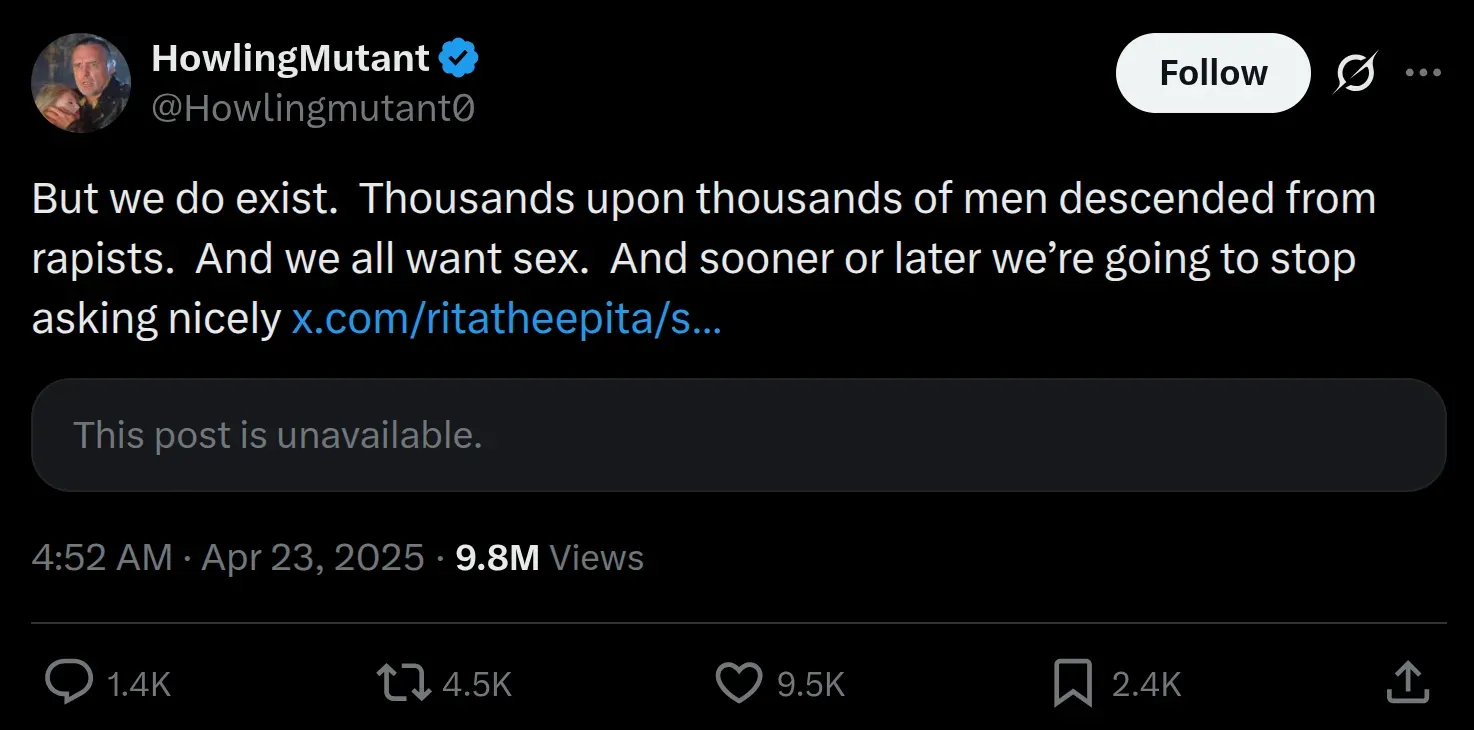 Prior to earning the follow from Vance, one of HowlingMutant’s most widely circulated posts stated: “But we do exist. Thousands upon thousands of men descended from rapists. And we all want sex. And sooner or later, we’re going to stop asking nicely.”