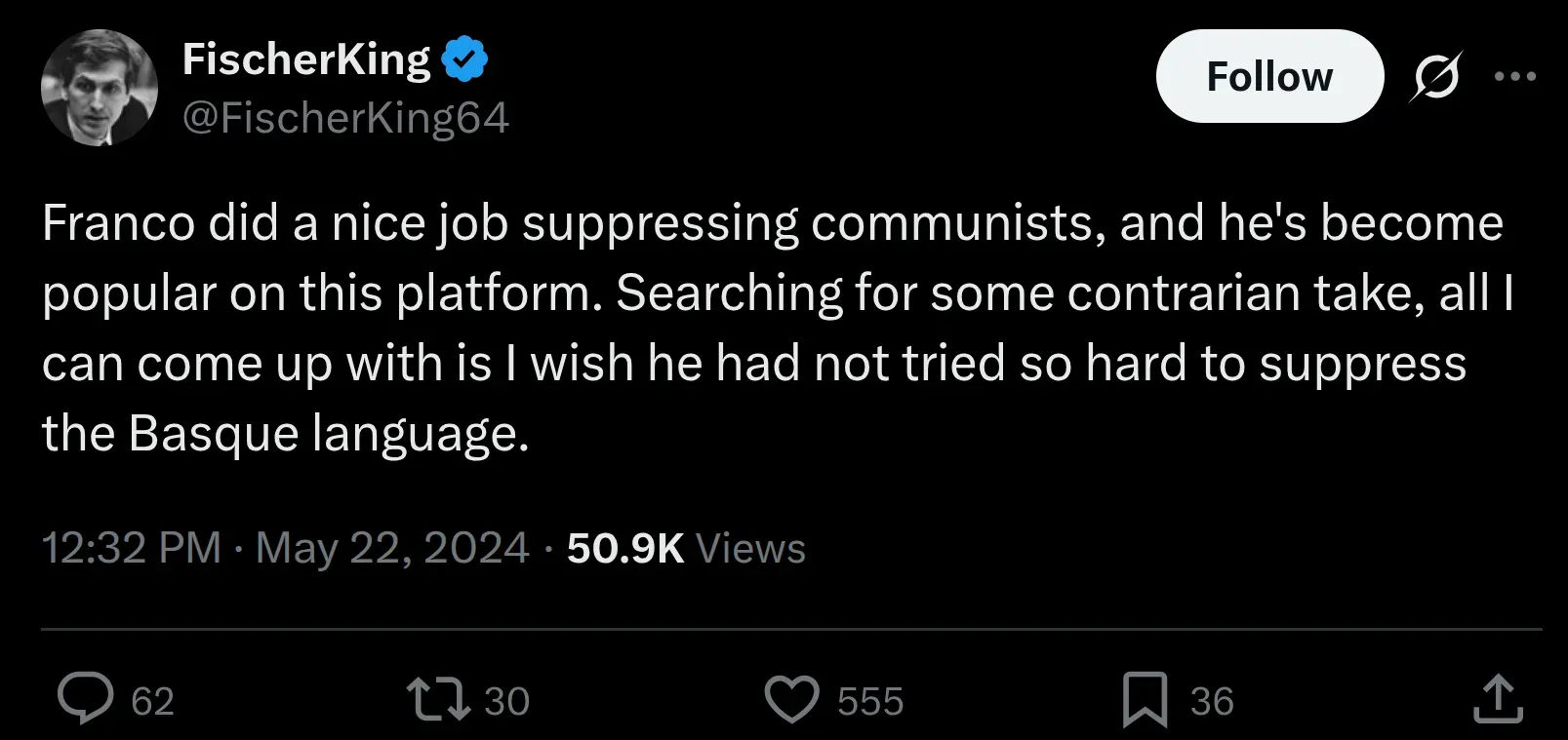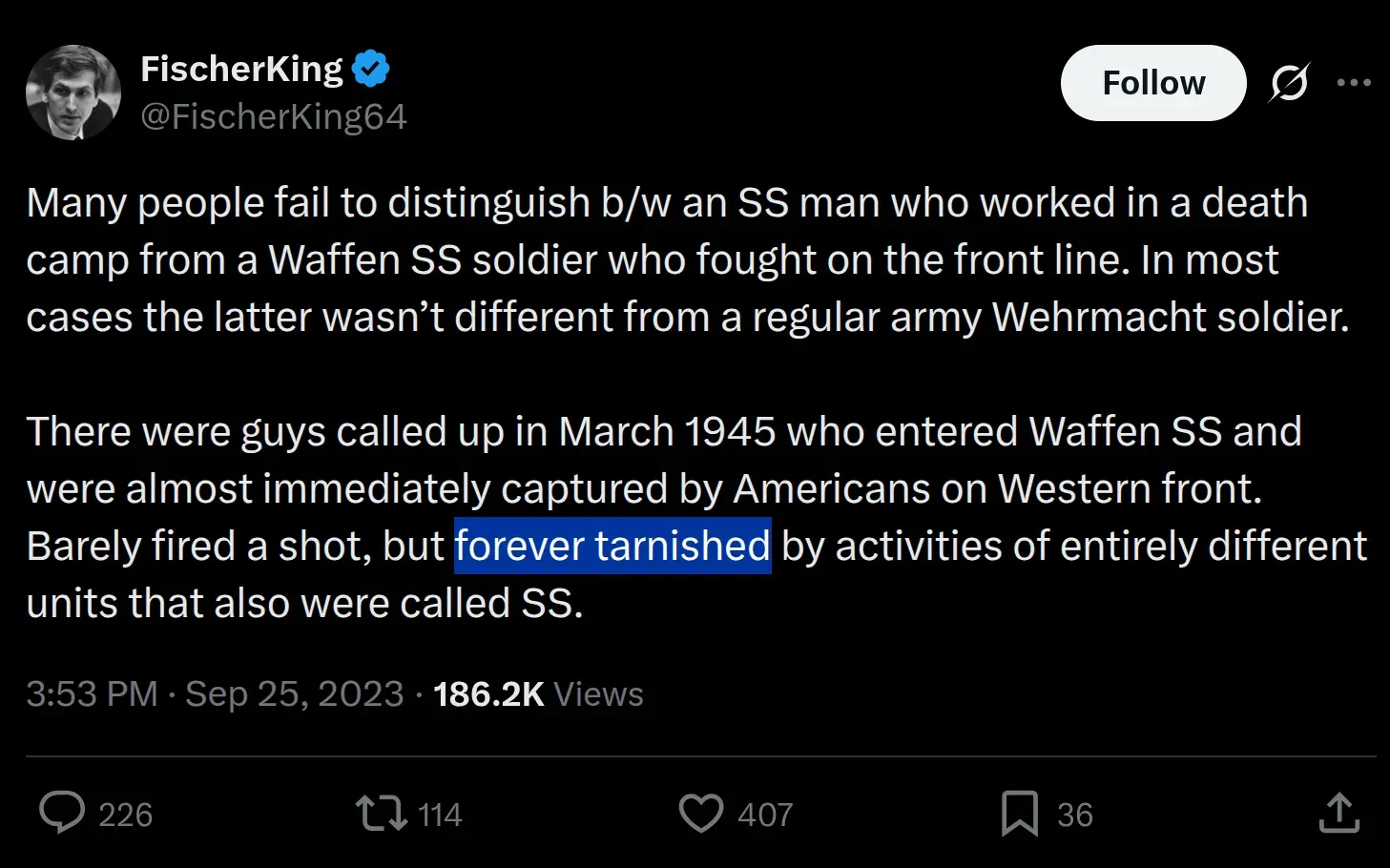 “FischerKing” has praised Spanish dictator Francisco Franco and expressed dissatisfaction with having Jewish followers. He has also lamented that the reputation of the Waffen SS was “tarnished” by the activities of camp SS units. His follow from J.D. Vance predates the 2024 election.