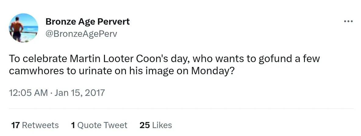 In a 2021 essay titled “Communittar Fools,” Alamariu wrote “I believe in Fascism or ‘something worse,’” and in a 2015 tweet from his previous now-suspended account, he described himself as “a fascist.” He also referred to Dr. Martin Luther King Jr. using a racial epithet and suggested fundraising for “a few camwhores to urinate on his image.”