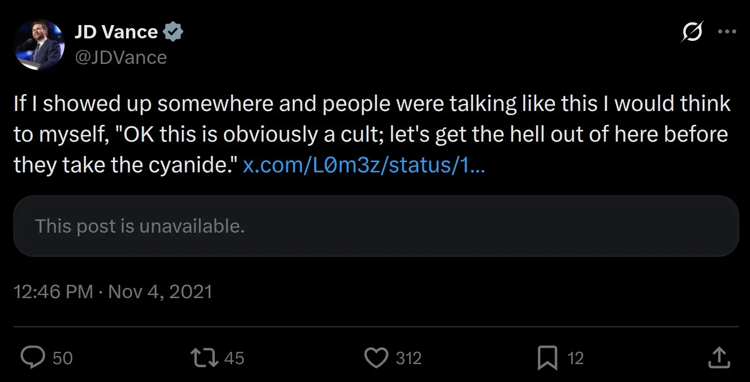 X’s search function showed one instance in November 2021—while Vance was running for the Ohio Senate seat—where he quote-posted Lomez calling Microsoft employees “bugmen” for stating their ethnicity and hairstyle when introducing themselves. The original post no longer exists and the URL was excluded from the Wayback Machine, but a snapshot is available on archive.today.