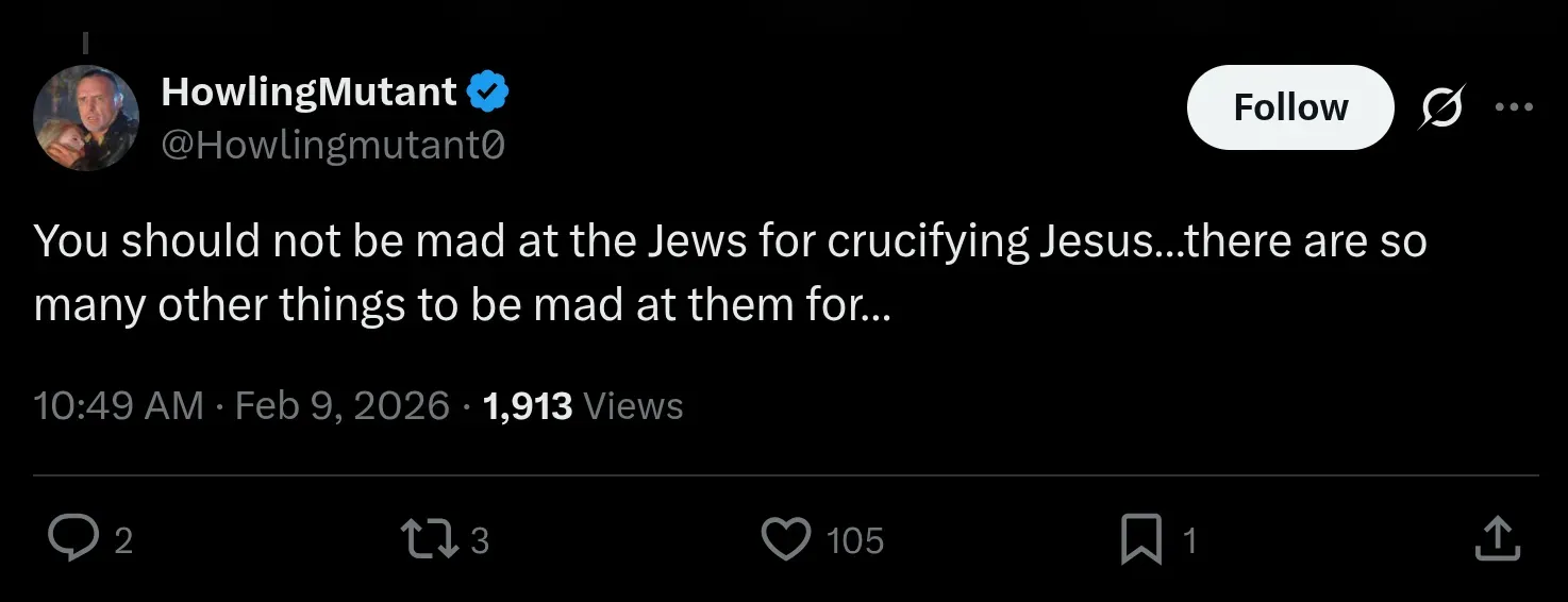 Of the accounts we are identifying, the most recent of Vance’s far-right follows is “HowlingMutant,” a pseudonymous far-right online personality with a long record of misogynistic, antisemitic, and racist comments. Since earning a follow from Vance, HowlingMutant has used the word “nigga” 23 times and wrote, “You should not be mad at the Jews for crucifying Jesus…there are so many other things to be mad at them for.” He has also made jokes referencing Holocaust denial talking points, like “wooden doors.”
