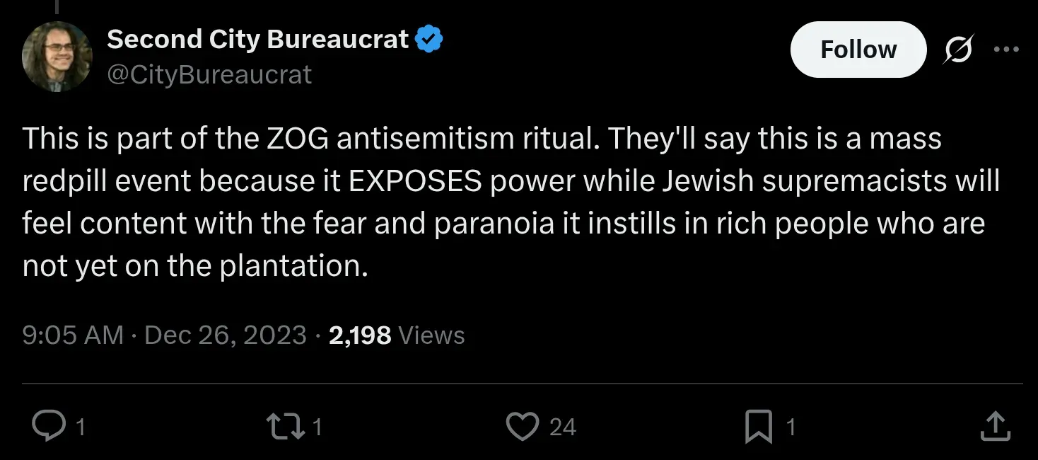 The Chicago-based “Second City Bureaucrat” has had a follow from Vance since at least June 2025. Posts are replete with antisemitic references like “ZOG” and “goyslop.” A 2023 post read, “Yeah, Schmuley, I'm trying to get people to support Israel by pointing out that Soros was more afraid of Iran. Your posts stink of hummus.”