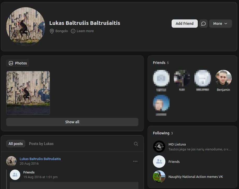 In addition, Decoherence Media identified a VKontakte account under the name Lukas Baltrušis Baltrušaitis. The account followed a page for the Lithuanian branch of neo-Nazi organization Misanthropic Division, and its friends list includes Benjamin Raymond, the founder of the banned UK neo-Nazi terrorist organization National Action. According to vk.watch (a website that archives historical snapshots of VKontakte accounts), an earlier profile picture for this VK account shows a man who looks similar to Baltrušaitis holding an LTJS flag.