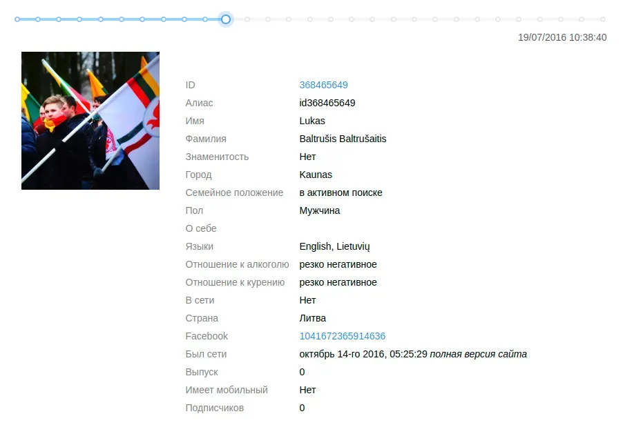 The Iron March user Teliavelis, who discussed the Skydas story with Slavros in private messages, registered for the forum with the email address “[email protected].” EPIEOS, a search engine that allows users to look up information associated with an email, returned the name Lukas Baltrušis Baltrušaitis for the address. This user also described themselves as a “self-educated video creator” and used an IP address that could be traced to the Lithuanian city of Kaunas.