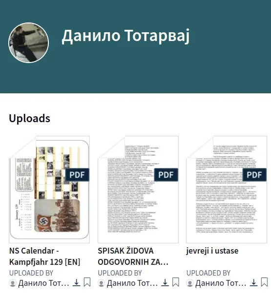 A Scribd account with the name Данило Тотарвај uploaded a calendar to the account called “NS Calendar,” with the birthdays of prominent Nazi officials and pictures of Nazi propaganda, with a dating convention that has the birth year of Adolf Hitler as year 1. A Facebook account with the same name and profile picture as the Scribd account is tagged in a photo of a man resembling the LinkedIn account’s profile picture. The Scribd account has since removed its profile picture.