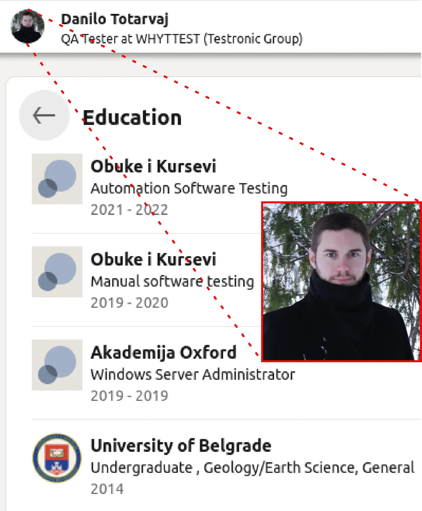 The second email address contains the English transliteration of the name Данило Тотарвај, Danilo Totarvaj. Among the Google search results for the transliterated name is a LinkedIn page for Danilo Totarvaj, who lists an undergraduate degree in Geology/Earth Science from the University of Belgrade as his education. Coincidentally, Змајевит wrote in a March 2015 post on Iron March that he was studying geology at the University of Belgrade. The LinkedIn account says he currently works at a small video game development company.