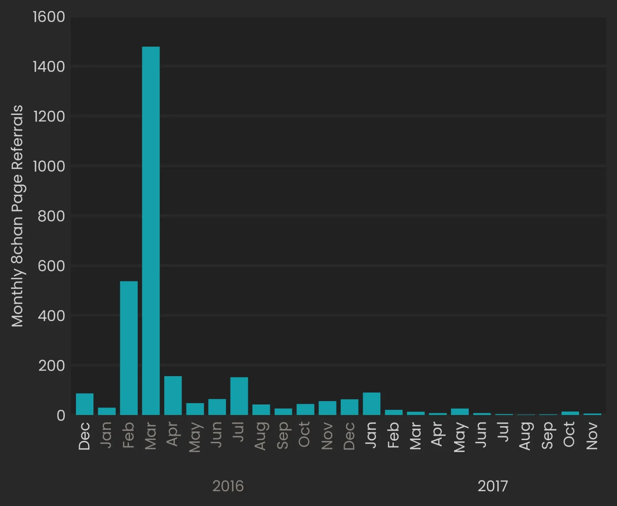 Breaking down the 8chan page referrals by month shows a sharp peak in February and March 2016. This corresponds to when Rope Culture ran ads (designed by Brandon Russell) on 8chan boards seeking article submissions. One such ad was captured in an archive of the /pol/ board from February 17, 2016.